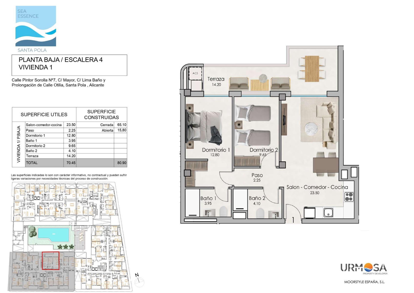 Moderno residencial cerrado compuesto por viviendas de 1, 2 y 3 dormitorios y 2 baños completos. El complejo está formado por 4 escaleras de apartamentos con amplias zonas comunes ajardinadas, que incluyen piscina, zona de relax y gimnasio.